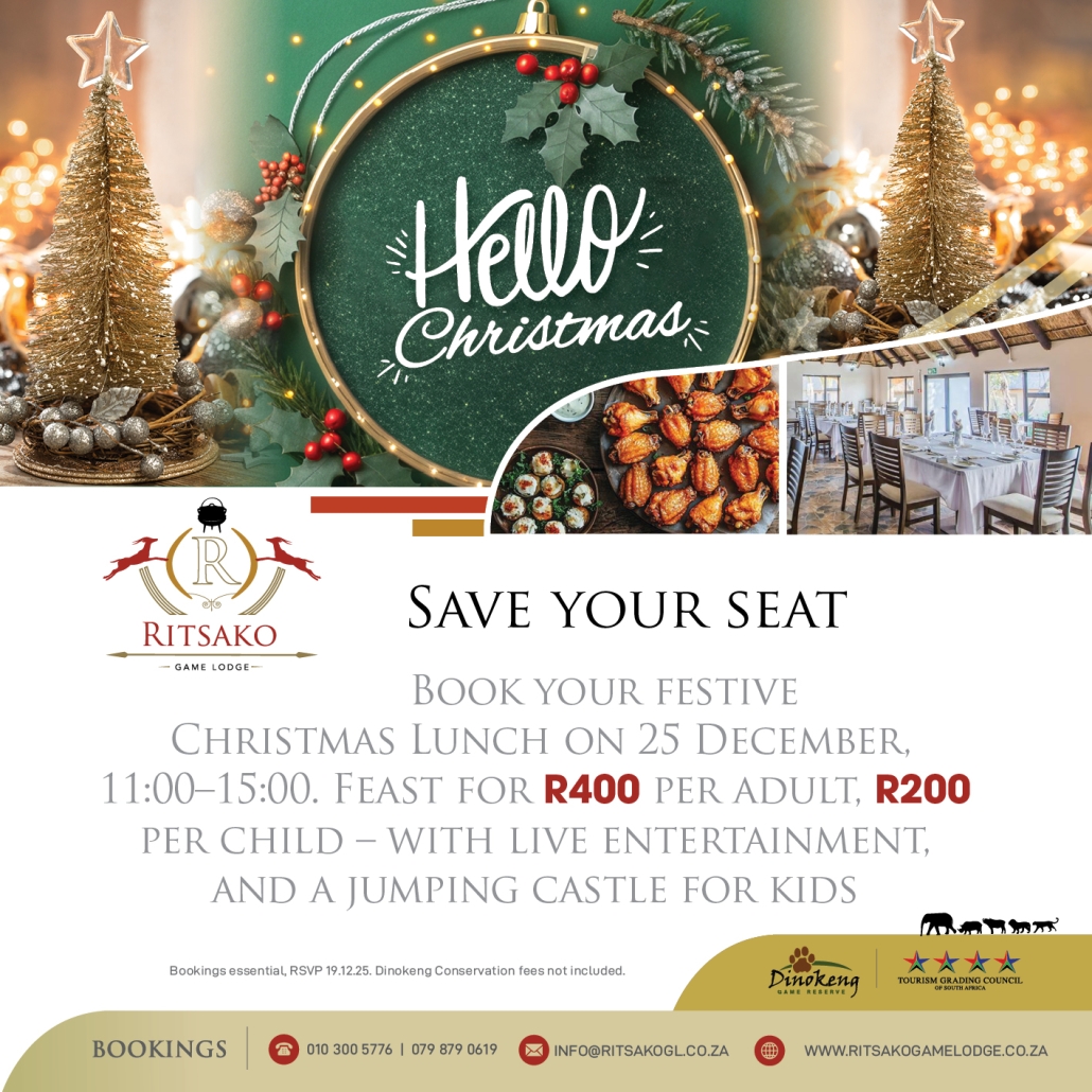 Bookings are essential – Reserve your spot early (events@ritsakogl.co.za) to take advantage of exclusive festive rates and ensure your seat at this unforgettable dining experience.