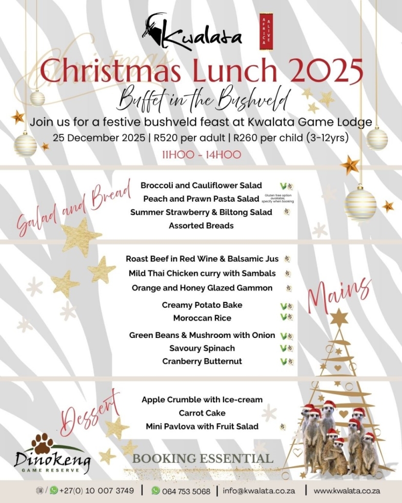 Tired of the same traditional Christmas dinner in the same four walls? This year, swap the tinsel for tamboti trees and the carols for the call of the wild. Kwalata Game Lodge invites you and your family to an unforgettable festive experience with their Christmas Lunch 2025: Buffet in the Bushveld.